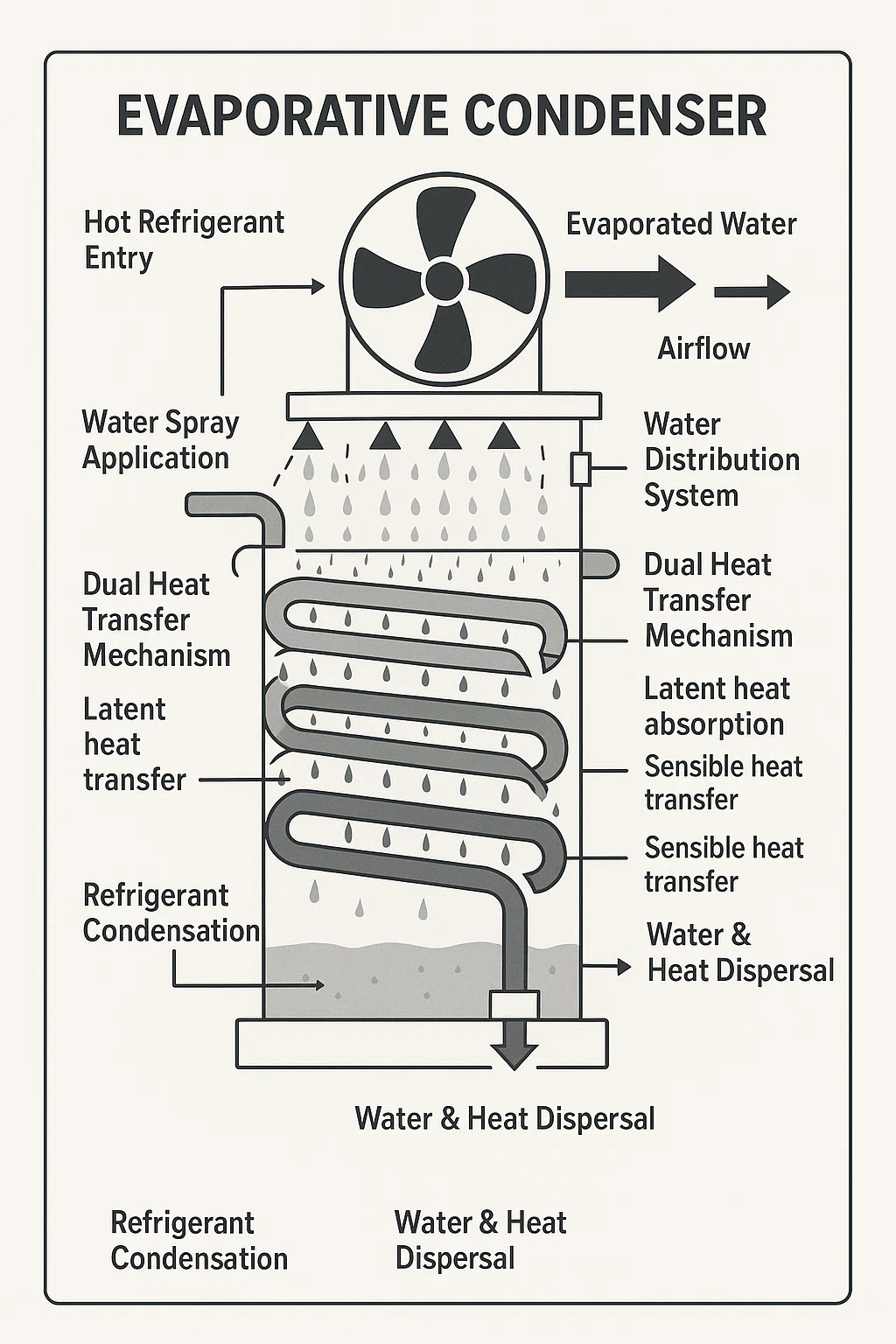 Los condensadores evaporativos rechazan el calor combinando el enfriamiento del aire con la evaporación del agua. A diferencia de los condensadores estándar que dependen únicamente de la transferencia de calor sensible, aprovechan la absorción de calor latente durante la evaporación del agua.