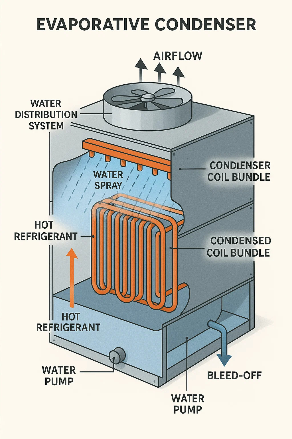 Un condensador evaporativo Integra refrigeración por aire y evaporación de agua para rechazar el calor de los sistemas de refrigeración. Su diseño y funcionamiento difieren fundamentalmente de los condensadores enfriados por aire estándar: