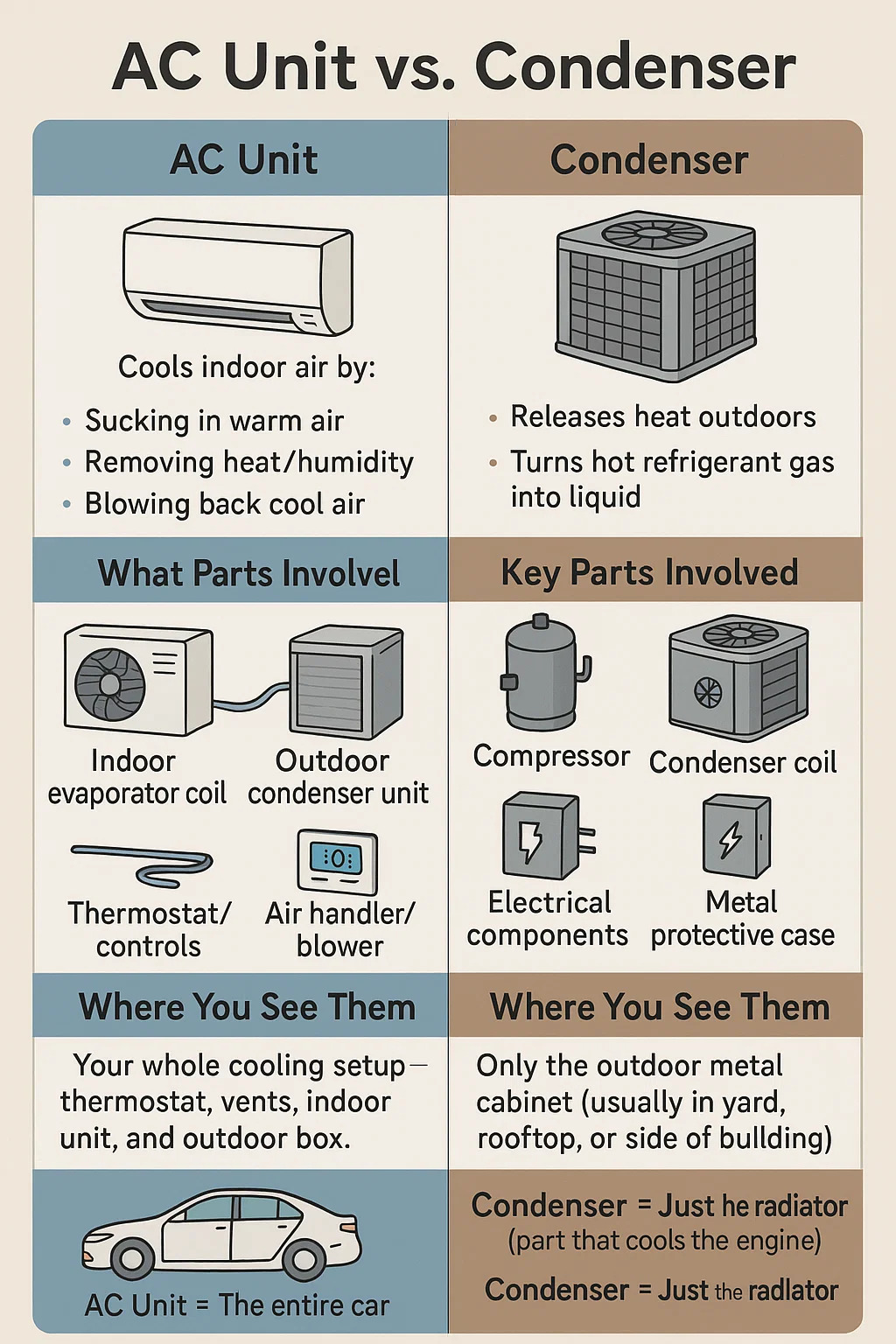 Condensador: Solo una parte de la unidad de aire acondicionado, específicamente, la caja metálica exterior que libera calor.